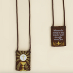 [Children's size] Bringing much-needed innovation to this beloved sacramental, this kid-sized scapular is perfect for young Catholics, especially those making their First Communion this year! It features an image of the Eucharist and the words Our Lady spoke to St. Simon Stock when she blessed his order with the brown scapular devotion.